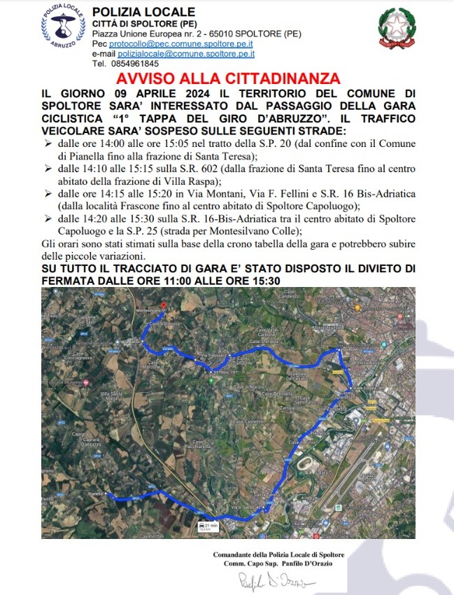 Divieto di sosta e fermata nelle strade interessate a partire dalle ore 11.00 (e fino alle 15.30): la viabilità sarà interrotta, orientativamente dopo le ore 13.00, e riprenderà al passaggio della carovana. Il provvedimento comporterà anche modifiche al servizio pubblico di trasporto TUA. E' necessaria infatti la sospensione della circolazione da 45 minuti prima del passaggio del veicolo Inizio-Gara e fino al passaggio del veicolo Fine-Gara, o comunque a cessate esigenze. In particolare le strade interessate dal percorso di gara sono la S.P. 20, S.R. 602, S.R. 16 Bis-Adriatica, Via Montani, Via Fellini e S.P. 25. La sospensione della circolazione avverrà, presumibilmente, dalle ore 14:00 alle ore 15:05 nel tratto della S.P. 20, dalle 14:10 alle 15:15 sulla S.R. 602, dalle ore 14:15 alle 15:20 in Via Montani, Via F. Fellini e S.R. 16 Bis-Adriatica e dalle 14:20 alle 15:30 sulla S.R. 16-Bis-Adriatica tra il centro abitato di Spoltore Capoluogo e la S.P. 25, ed infine dalle 14:25 alle 15:30 sulla S.P. 25.