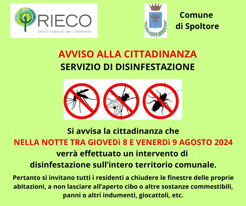 Nella notte tra giovedì 8 e venerdì 9 agosto 2024 verrà effettuato un intervento di disinfestazione sull'intero territorio comunale. Pertanto si invitano i residenti a chiudere le finestre delle proprie abitazioni, a non lasciare all'aperto cibo o altre sostanze commestibili, panni o altri indumenti, giocattoli, etc.